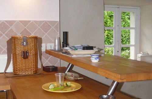 It includes a living room with a sofa bed (width 1.40m) including a Simmons quality mattress, an open kitchen with its bar, an Italian shower. Quiet and not overlooked.