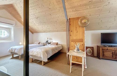 Providing a garden, Maisons Ooyat features accommodations in Grospierres. With garden views, this accommodation provides a terrace and a swimming pool. Free Wifi is available throughout the property and Pont d'Arc is 11 miles away. The air-conditioned vacation home consists of 3 bedrooms, 2 living rooms, a fully equipped kitchen with a dishwasher and a coffee machine, and 1 bathroom with a walk-in shower and a hair dryer. Towels and bed linen are featured in the vacation home. The property has an outdoor dining area. Ardeche Gorges is 12 miles from the vacation home, while Paiolive Wood is 6.9 miles away. Nimes-Ales-Camargue-Cevennes Airport is 62 miles from the property.
