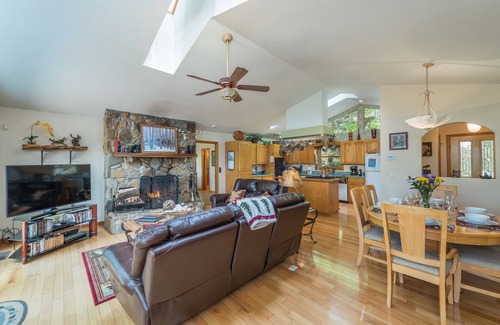 Eagles Nest is beautifully appointed and decorated with all your comforts in mind. It is so easy to relax on a chilly winter day in front of either of two oversized wood-burning fireplaces. The main level boasts hardwood floors, two bedrooms, two baths, a living/dining room, and a large kitchen equipped with everything you could dream of including a KitchenAid gas stovetop, convection oven, microwave, dishwasher, and coffee maker. We provide service for 10 with every type of glass you could ever need from white and red wine to rocks, juice, tea, and martini glasses. The kitchen looks out onto the view so you can enjoy the birds and the ever-changing views as you prepare your favorite meal. The living room has a 55" Smart TV and CD/DVD player with indoor and outdoor speakers. We also offer FREE high-speed WI-FI for your enjoyment as well as a large library of books and CD’s.