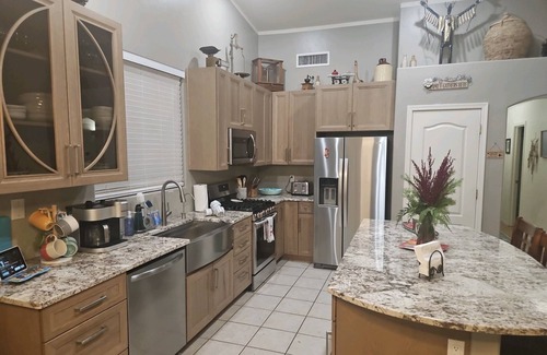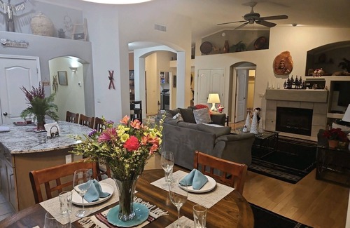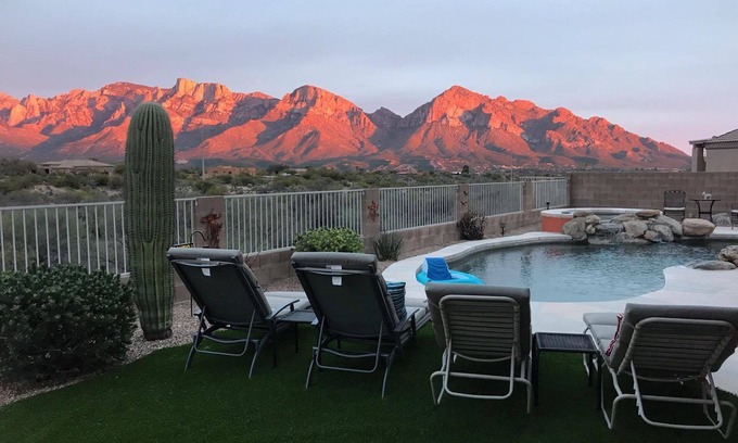 Vacation with views in one of Tucson's best areas for easy access to shopping and recreational attractions! An outstanding vacation home in a quiet neighborhood with covered patio and beautiful pool (Pool can be heated for an additional $390. plus tax per week) from October 1st to April15th. From April 16th to sept 30th. Is $320. Per week plus tax water fall feature and spa (spa heat included, on demand at no additional cost,) complete with barbecue, outdoor furniture, pool toys, corn hole, putting green and lounges. Take advantage of the Arizona sun or relax and read in the shade of the patio or umbrella.
