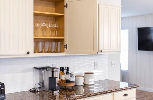 The kitchen is equipped with black stainless steel appliances, Keurig machine, toaster, air fryer, and basic cooking essentials to allow you to prepare your own