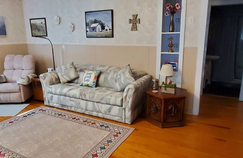 The Rainbelt Home is located in Meade Kansas within Blocks of Shopping, Dalton Gang Hideout, Meade County Historical Museum, the park, and the Hospital. The Meade County Fairgrounds is located within a 5 minute drive. This home has 2 separate bedrooms, 1 bath, and a fold out couch in the living room so the property will sleep 6. A spacious kitchen with a Coffee/Tea/Snack bar located within the kitchen area. The kitchen has all of the appliances ,dishes and most other items needed for your stay. There is a smart TV which is loaded with the following applications: Hulu, Disney +, ESPN +, Discovery +, and many more. So you can Binge watch many programs during your time here.