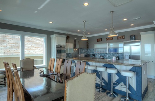 At Making Waves, enjoy exclusive features that cater to your every need. Indulge in the huge heated beachfront pool and hot tub, perfect for relaxing before or after your wedding festivities. The house features over 4,300 square feet of living space with panoramic ocean views from almost every room. You'll find a gourmet kitchen equipped for any culinary adventure, and a spacious dining area that comfortably seats 18, with additional outdoor seating available. The generous outdoor decks—over 2,000 square feet—make for a lovely setting for pre-wedding gatherings or post-ceremony celebrations while listening to the serene sounds of the waves.