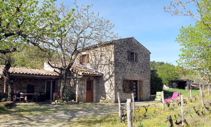 Rustic house "Malbosc", 250 m a.s.l detached, surrounded by vineyards. 2 km from the centre of St. Genest, 7 km from the centre of Joyeuse, 25 km from the centre of Aubenas, 7 km from the river, in the countryside. Private: property with meadow, orchard. 80 m long bumpy motor access (via unmade road). Shop 3 km, supermarket 7 km, bus stop "Lablachère centre" 2 km, railway station "Montélimar" 70 km, pebble beach "River Beaume (Joyeuse)" 7 km (small).