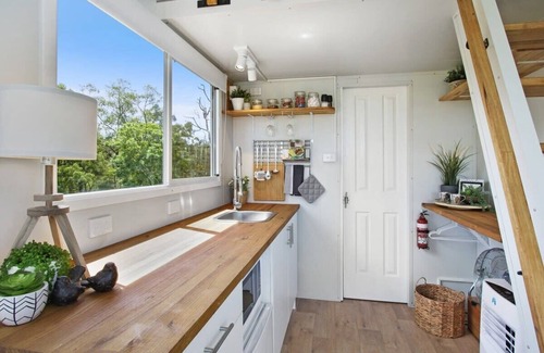 A cozy 170-square-foot tiny home with a lofted queen-sized bed and a convertible single-bed couch on the ground floor. It has easy access to water, split air conditioning, a kitchenette, cooking equipment, and excellent bathroom facilities including a flushed toilet, hand basin, and gas-heated shower—making it a perfect choice among relaxing holiday homes.