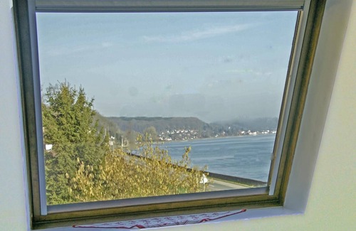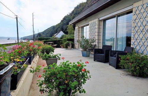 On the 1st floor: small kitchen (dishwasher, ceramic hobs, microwave, washing machine), sitting/dining room (TV, DVD player, stereo), 1 bedroom with a double bed (140x190 cm), shower room, separate toilet. Central heating: 6.50€/day (if used). Beds made when you arrive. Cot. Optional housecleaning service: 30€. Tourist tax. On the 1st floor of the owners' house (same entrance), this flat has an amazing view over the River Seine. Along the "Route des Abbayes et des Fruit" (the Abbeys and Fruit Road which passes in front of the cottage), you will enjoy the 3000 m² enclosed garden, punctuated with the boats passing on the River Seine. On the Road to Impressionism.