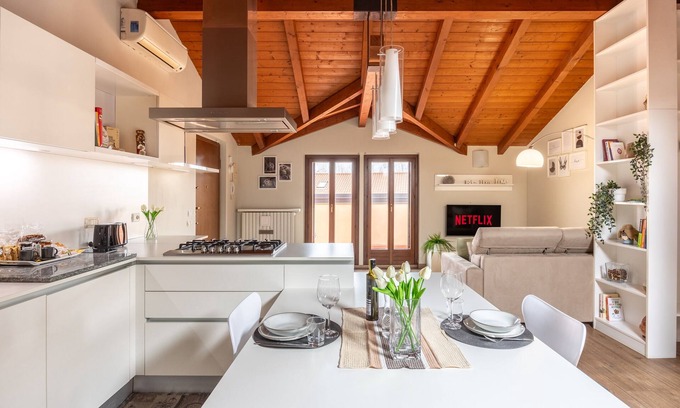 Wooden roof with exposed beams, relaxation terrace, free WiFi, Smart TV with Netflix, complete with everything to offer you maximum comfort in a prestigious context.
