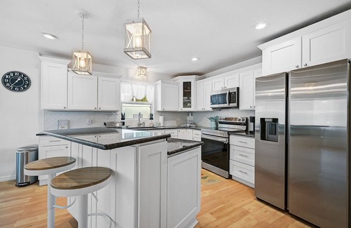 Escape to your own private paradise with this stunning vacation rental. Enjoy the private pool with waterfall (Pool heat may be requested at an additional charge of $35 plus tax per day during winter months- must be requested before arrival) or relax the day away in a hammock or swing chair beneath the palms. The professionally decorated tropical vibe of this home will transport you to a world of luxury and relaxation. With two guest suites featuring en- suite bathrooms and a kids bedroom with two sets of bunk beds and a large screen TV, there is plenty of space for everyone to unwind and enjoy the ultimate vacation experience. Two living rooms, laundry room, fully stocked kitchen with new appliances, large dining table to accommodate family and friends, and playground at Lewis Park within walking distance (7-minute walk) Don't miss out on this dream getaway!