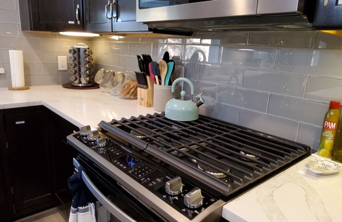 •Open kitchen with gas stove.