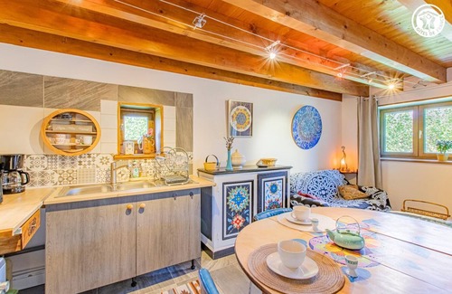 Both passionate about art and nature, Anne & Bernard open the doors to an authentic large traditional house dating from the 19th century, a charming "maisonnette" restored & revisited as a relaxing holiday retreat, nestled in the peace and quiet of a picturesque little rural residential hamlet with old-world charm. Absolute tranquility in the heart of unspoiled countryside, to explore during relaxing walks or mountain bike rides, nestled in the heart of the magnificent local bocage (where the peaceful & famous Charolais cows graze), in the hollow of the green Guye valley (& its fish-filled river) in a protected area in ZNIEFF for its rich fauna & flora. Magnificent landscaped setting all around, combining fields of crops & wooded meadows, hillsides of vineyards and beautiful wild forests. Enchanting rural & natural setting & 100% relaxing. Spacious gîte with good comfort. A gentle country charm with a flea market and bohemian feel, combined with the owner's unique mandala-inspired decor (elegant murals, painted furniture, and paintings). A cozy, cabin-style bedroom nestles under the eaves. A large, exposed terrace (complete with a lovely sheltered mini-terrace) opens onto a pleasant 250m² enclosed flower garden, dotted with the owner's stone sculptures, and offering an unusual mandala vegetable garden cultivated using permaculture techniques (arranged in a circle and rich in numerous perennial plants; picking possible with the owners' consent). Composition: Detached house adjoining the owners' house (complete independence) on a gated property. Electric heating. Duplex gîte. Ground floor: living room-kitchen-lounge (single-person sofa bed 130x180cm as an extra), bathroom (shower/WC). 1st floor: mezzanine bedroom (double bed 160x200cm). Terrace + mini sheltered terrace + enclosed garden (250m²) + bicycle storage + private parking. Mini-market 7 km away. Supermarket & small shops 10 km away. All amenities 19 km away.