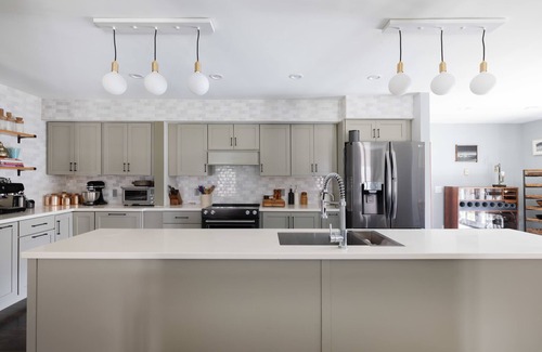 Step into the thoughtfully designed layout, with plenty of nooks to gather. To the right, a sleek, modern kitchen awaits featuring soft grey cabinetry, white quartz countertops, a classic subway tile backsplash, high-end appliances, and a spacious island perfect for gathering. Adjacent, the cozy living room invites you to unwind with a plush gray sofa, a fireplace set against a light-toned tile wall, a TV, and floor-to-ceiling windows with easy access to the pool.