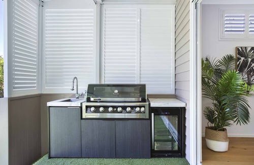 Entertainers will enjoy a fully equipped kitchen, plus a handy kitchenette adjacent to the alfresco area, for convenience for those choosing to relax poolside. The main kitchen being the hub of the home is located upstairs and features a large island bench, stone bench tops, Ilve oven and gas cooktop.