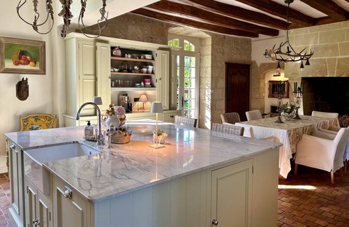 - Open-plan kitchen, fully-renovated and equipped including La Canche gas range with five burners, three ovens, a barista-style coffee maker, a larger central island with bar seating and dining area with French doors leading to the garden