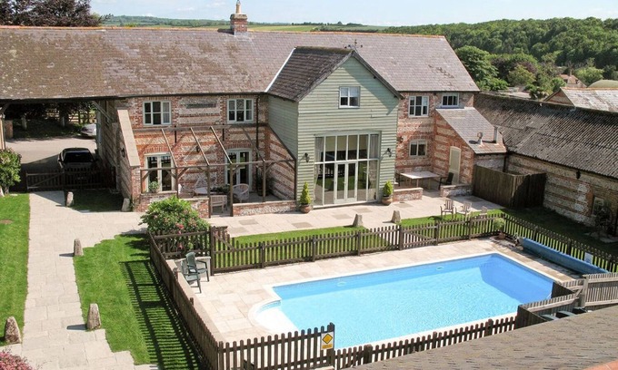 This well-presented barn conversion lies in the village of Dewlish and can sleep 15 people in eight bedrooms.