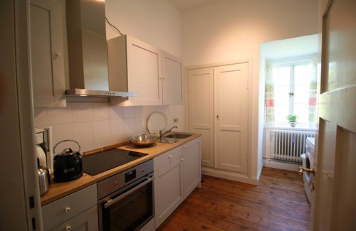 You live in a renovated manor house in the outskirts of a village. Your apartment is on the 2nd Floor. The staircase leads to the entrance to the apartment on the side of the manor house. The new kitchen is equipped with modern electrical appliances. In the event that any wishes remain open, I spontaneously help with everything my household has to offer. There is also enough space in the apartment to set up your own travel cot.