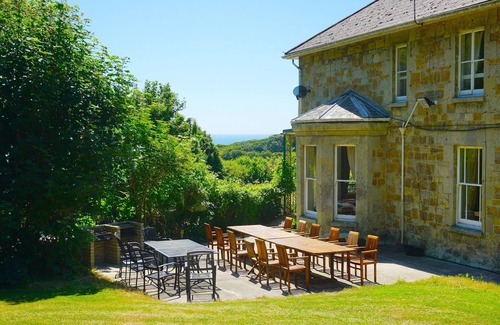 FANTASTIC EXCLUSIVE USE VICTORIAN MANOR IN AMAZING LOCATION FOR WEEKEND HOUSEPARTIES, CELEBRATIONS & HOLIDAYS. LOADS TO ENTERTAIN YOU - AMERICAN POOL, TABLE TENNIS, HUGE DINING ROOM, LOUNGE, GAMES ROOM & BAR, ENORMOUS SMART TV & SKY SIGNATURE & SPORTS CHANNELS, WIFI. MASTER BEDROOM WITH REGAL SUPER KING 4 POSTER BED. TERRACES; ENTIRELY PRIVATE; PERFECT FOR ROMANTIC WEEKENDS, CELEBRATIONS WITH FAMILY & FRIENDS, VIP HIDEAWAY. ACCESS TO TENNIS COURT BY PRIOR ARRANGEMENT. PRIVATE OUTDOOR UNHEATED SWIMMING POOL (JULY & AUGUST ONLY). ALL 11 BEDROOMS ENSUITE. BANQUET TABLE AND BARBECUE TABLES SEAT ALL GUESTS. HUGE CATERING AND FAMILY KITCHENS FARMHOUSE BREAKFAST TABLE. STUNNING GROUNDS, SEATS IN SUN & SHADE. MINUTES’ WALK TO SMUGGLER’S COVE & AROUND ISLAND COASTAL PATH. PRIVATE, EXCLUSIVE, SECURE FOR YOUR GROUP OF FAMILY, FRIENDS, COLLEAGUES. BIG GROUPS, SMALL GROUPS, ALL AGES. SECURITY, HOUSEKEEPING, CATERING, BARBECUES, TRAVEL, ENTERTAINMENT - BESPOKE PACKAGES TO SUIT YOU OR JUST ENJOY THE PRIVACY AND EXCLUSIVITY OF THIS SPECIAL PLACE.