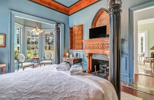 We invite you to stay at Mansion at Rose Hill in the majestic Lowcountry. This Gothic Revival, circa 1858 is a National Register of Historic Places nestled along the Lowcountry marshes and moss draped live oaks of the Colleton River in Bluffton, South Carolina. Upon entering Rose Hill Plantation, guests are greeted at the 24 hour community guarded entrance. Guest passes are required upon entry and will be provided by Mansion at Rose Hill during time of stay. Journey through the community passing the Equestrian Center, Polo Fields and many estate homes to arrive at the private gates of Mansion at Rose Hill. Our property offers over twelve fenced in acres to explore and experience.