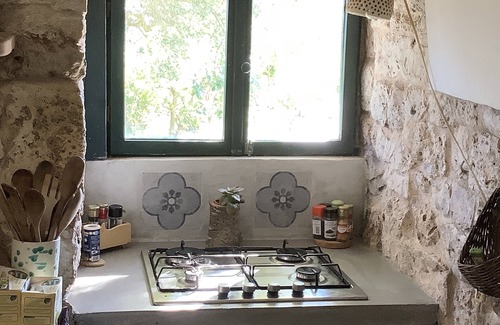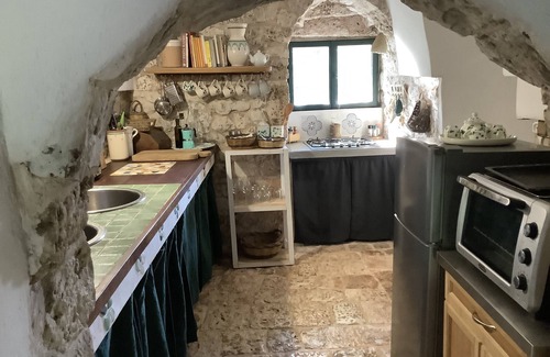 This beautiful trullo lies in the heart of the country in an ancient olive grove plantation organically cultived.It date back the ninetheen century and has been recently restored maintaining the original characteristics using only local material and it has been tastefully and originally furnished by the owners.There are two double bedrooms,a bathroom with shower,a central living area with sofa,comfty chairs,stereo-cd,a delicious dining alcove with openfire,kitchen with fridge,hob and hoven,a beautiful dried-stone walled garden equipped with table,chairs,gazebo,barbecue,external shower ,a washing machine is also available.A beautiful paved patio area in old stone is in front of the trullo.
