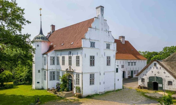 Holiday on the North Sea Castle. Cozy 2-room apartment Caspar Hoyer in the mansion Hoyerswort with about 40 square meters on 1 level (1. Floor) for up to 4 people. In a quiet location in the countryside at the castle in Oldenswort. The wooden floor and the historic ceiling beams give this apartment a unique atmosphere. The interior mixes modernity with restored pieces of jewelery. From all rooms you have a beautiful view of the countryside. Dogs are welcome!Living / bedroom with sofa in front of the large fireplace, reading corner with armchairs, dining table for 4 people, a flat screen TV (satellite), a stereo system with CD player, wardrobe and an alcove double bed (160 x 200cm) .Separate kitchen with a stove with oven and fridge freezer. Bedroom with 2 single beds (each 90x200cm) and a wardrobe. Bathroom (shower room) with shower, toilet and hair dryer. Hall with wardrobe and antique mirror in the entrance area. Castle guests can use the terrace as well as the garden with garden furniture, barbecue and sunbathing area. In the former staff kitchen of the west wing is today a cozy seating area for sociable moments. Highchair and travel cot available free of charge (subject to availability) .Parking space available. Covered bicycle storage in the barn. Free Wi-Fi. Free washing machine. The bed linen and towels are provided. Smoking is not permitted. NOTE: at this domicile will be from the 3. Person a rental surcharge of 5 euros per night for each additional person charged.