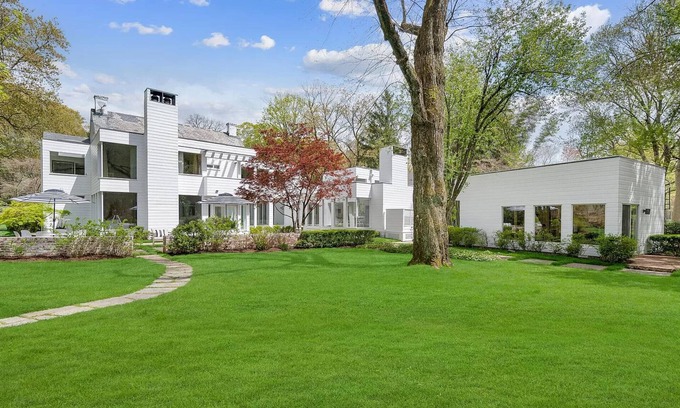 This stunning mansion in Greenwich Connecticut is a one-of-a-kind property. Set on 3 acres of land, the gardens are vast with their own personal lake to swim in, three private bridges and scenic river with ducks. This grand home blends elements of traditional and contemporary architecture . A gorgeous setting with both privacy and natural beauty. In this 6 bedroom property the floor to ceiling windows throughout capture the stunning lake and river outside from this sun-drenched home. Includes an elevator, home gym, conservatory, free standing bathtub, rainfall showers with spa massage setting, home bar with wine fridge, cinematic size TV, master bedroom with roof terrace access, 5 fire places, furnished outdoor patio. 6,965 square feet in total, 3.2 acres.