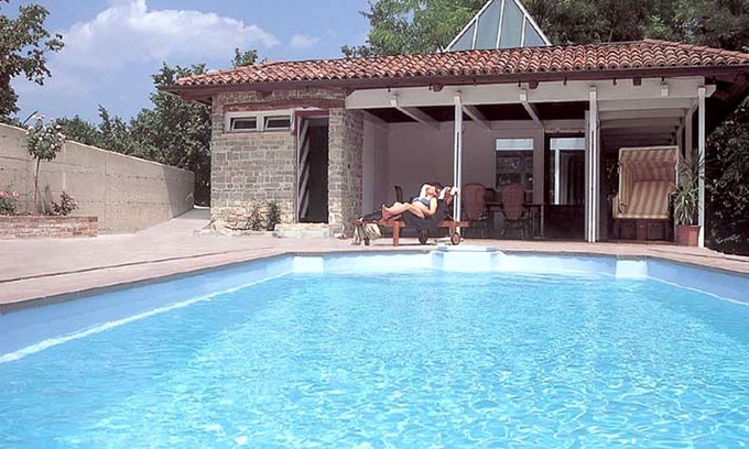 wood cooker, heating, terrace(private, roofed, 18 m2), terrace(18 m2), garden, garden furniture, parking, swimming pool(shared with other guests, 10 x 4 m., opened from May upto and including Oct)