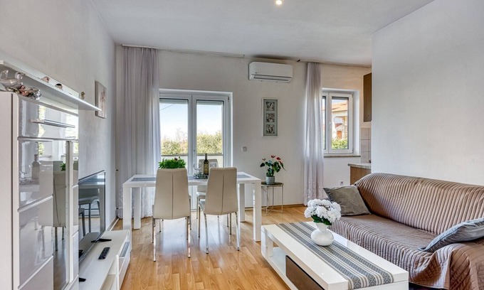 In the village of Stranići, not far from Nova Vas and Poreč, this comfortable two-bedroom apartment on the ground floor of a family house is located. The apartment offers two bedrooms, a living room with a small kitchen and a spacious terrace overlooking the beautifully landscaped garden. Guests have access to private parking within the fenced yard, and for additional comfort, the living room is equipped with air conditioning.