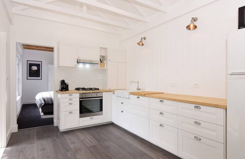 Farmhouse style double Dutch doors provide a unique light filled entry. Open plan kitchen/dining and lounge area with cathedral ceilings and a pot-belly fireplace - firewood provided from May to September - for those cool winter nights. The fully equipped kitchen boasts new gas appliances, a coffee machine and everything you need to cook or bake, while the outdoor barbeque provides for relaxed dining. Twobedrooms superbly appointed to help you enjoy a peaceful retreat. The cottage has spectacular open rural views from every room and French doors leading out to a large entertaining deck as well as a small deck to soak up some tranquillity and privacy. The modern bathroom includes a large walk-in walk-out shower and a cast iron free-standing bath with lovely views across the property and beyond.