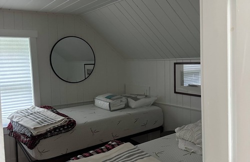 The white barn is a separate guest house which is brand new and includes a fitness room with a treadmill, elliptical machine and weights as well as a steam room, infrared sauna and a Soake pool outside that has incredible views of Burke Mountain. There is a full kitchen with new Thermadore appliances. The open family room and dining area have beautiful views of Burke as well as a gas fireplace. Upstairs there is one bedroom with a queen size bed and bathroom as well as unique, built in twin beds crafted from antique beams. There is a washer and dryer as well as WiFi in the barn.