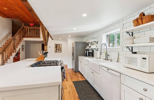 A queen-bedded guest room is tucked privately down a short hall to one end of the home with a separate full bath, while the primary suite is located on the other. This room has direct access to the deck, a king-sized bed with gingham headboard and crisp linens, and a full bath with jetted tub, separate shower, and double vanity. Additional space to enjoy at Maple Fox includes a loft area with three twin beds and a bonus bunk room on the main level.