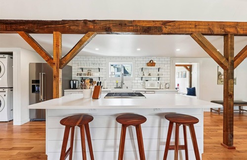 This unique Vermont barn-turned-home has been beautifully thought out and offers a warm welcome from the moment you enter. Rustic and modern elements blend smoothly throughout, and careful thought has been put into comfortable spaces and furnishings. Natural elements such as warm wood flooring and hand-hewn beams are found throughout the home. The open floor plan features a bright white kitchen with subway tile backsplash and all new appliances. An adjacent dining area features built in banquette seating and sliding door access to the deck. The raised wood stove providing warmth and ambiance is the focal point of the sitting area, while the TV and a plush and cozy couch beg for movie night in the living area.