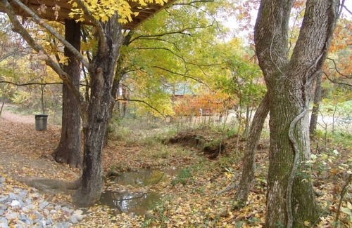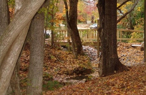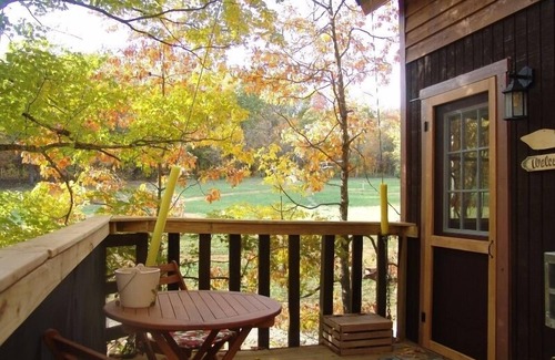 Stay in a real Treehouse! Unfortunately, VRBO does not offer a category for tree houses so we had to list this as a cabin. The Maple Oak treehouse is perfect for 2.... It will sleep 4 but we do not recommend it for 4 adult sized people (unless you really really like each other!) Maple Oak treehouse is perched about 16' up between a Red Maple and a White Oak over a small creek bed. There is a 2 person swing under the lower deck to sit and enjoy your campfire. Table and chairs are provided on both the upper and lower decks.