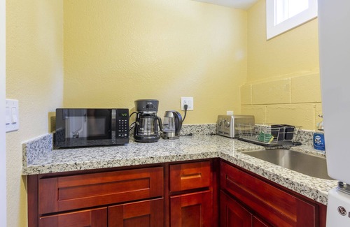 • no full kitchen, but equipped with refrigerator, microwave, hot water kettle and coffee machine, toaster
