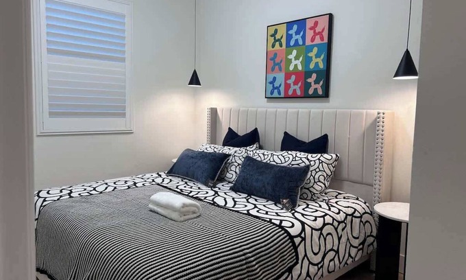 Relax in beautifully designed spaces, from the open-plan living area with its large sectional sofa to the two uniquely styled bedrooms—one featuring bold pop-art, the other a serene coastal vibe. Whether you're here for work or leisure with family and friends, this home provides the perfect escape for a memorable stay. This spacious 1,656 sqft home is designed for a comfortable and modern living experience. Enjoy thoughtfully curated details and all the conveniences of home.