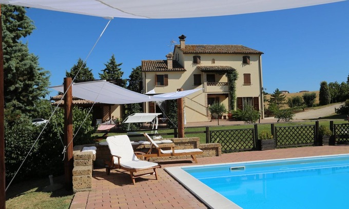 This Countryhouse is located in the rolling hills of the Marche Region, amidst golden fields and small villages rich in history. The farmhouse dates back to 1900, and has been renovated with attention and attention to detail. The owner occupies a part of the building, without disturbing the privacy of the guests. Guests will have at their disposal a large outdoor area with garden and a swimming pool area equipped with sun loungers and umbrellas. This large accommodation is located on the ground floor and has 4 en suite bedrooms with air conditioning. Guests will find in this farmhouse the perfect place for lazy days relaxing by the pool, or setting off to discover a region waiting to be discovered among history, art, nature and landscapes.