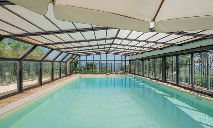 Perched approximately 500 meters above sea level, "La Dimora Nascosta" invites an exquisite escape, perfectly renovated and embraced by the serene Marche countryside. This refined residence offers 450 sq m of elegant interior space, plus a 110 sq m annex. Comfortably accommodating up to eight guests, it's an idyllic haven where historical charm intertwines with modern luxury, promising spacious living for unforgettable moments. Step inside to discover a harmonious blend of contemporary design and antique furnishings. The villa boasts welcoming lounges, fully equipped kitchens, and tastefully appointed bedrooms. Each floor features luxurious bathrooms with hydromassage showers. The basement provides a gym, a hydromassage tub, and a laundry room. The annex, connected by a stylish iron and glass corridor, ensures privacy. Set within 3,800 sq m of grounds, the outdoor spaces delight with an impressive indoor swimming pool (8x14.5 m), perfect from May to October. An enchanting outdoor dining area elevates al fresco meals. Beyond your paradise, Marche wonders await. Near Tolentino, this villa offers seamless access to the breathtaking Conero Riviera (beaches, azure waters) and the majestic Sibillini Mountains Park (nature haven). This exceptional base is perfect for cultural excursions, culinary delights, or naturalistic explorations. Designed to host three families, it allows private sanctuaries while sharing cherished memories in the heart of Italy.