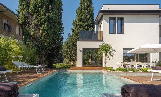 Marea is a recently built, modern villa located in Scacciano, close to the beaches of Riccione and the Romagna Riviera. With contemporary designer style throughout, its spacious interiors span four double bedrooms, a kitchen and a living area overlooking a private garden and swimming pool. Its energy-efficient design and air-conditioned bedrooms ensure a comfortable stay. Sleek decked terraces, lawns and trees set the scene for the outdoor dining area, relaxation and pool. Just 4 km from the coast, the villa offers easy access to sandy beaches, family attractions and vibrant seaside towns. Marea shares a border with its twin villa, Onda, and the two can be rented together for larger groups. Note: given its proximity to some of the Riviera’s most popular seaside resorts — particularly lively during the summer months and holidays such as Ferragosto — the setting may feel more vibrant compared to that of a secluded countryside retreat.