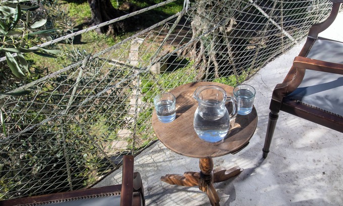 If you enjoy nature and are looking for a peaceful place to relax, the treehouse is the perfect spot to be. The estate is located between olive groves, combining an amazing view of the sea in front and the mountain behind. The Treehouse itself is build on an olive tree at 7 meters high, and is equipped with a double bed, hammock, bathroom, balcony. A second housing is just beneath it, where you can find on two levels the kitchen, double bed, bathroom, fire place. All wood work is made out of olive tree, giving everything a cozy and warm aesthetic.