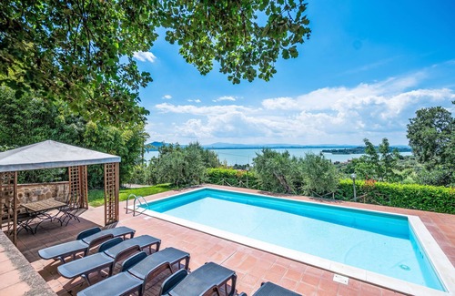 Modern, comfortable country house "Mariani", detached, surrounded by trees and fields. 900 m from the centre of San Feliciano, on top of a hill, 1 km from the lake. Private: property 7'000 m2, garden 1'000 m2 (not fenced), swimming pool (4 x 10 m, depth 140 cm, seasonal availability: 15.May. - 30.Sep.). Outdoor shower, patio, barbecue. Bumpy, steep motor access (500 m via unmade road). Parking on the premises. Supermarket, restaurant, bar 900 m, bus stop 150 m, ferry 1 km, grass beach 2 km, bathing lake "Trasimeno" 1 km. Marina 1 km. Nearby attractions: Passignano Sul Trasimeno 14 km, Castiglione Del Lago 22 km, Perugia 24 km, Cortona 33 km, Città Della Pieve 33 km, Assisi 44 km. Please note: car recommended. The owner does not accept any youth groups.
