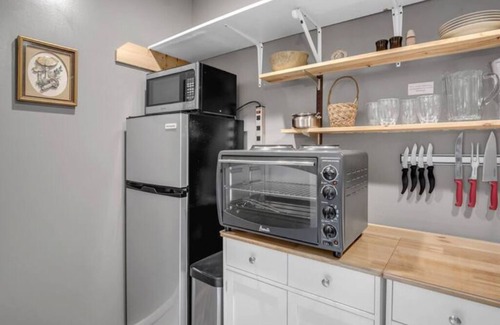 Kitchenette is stocked with apt sized fridge/freezer, convection oven with stovetop, microwave, dishes, pots and pans, crockpot, Keurig coffee pot & single-serve beverages.