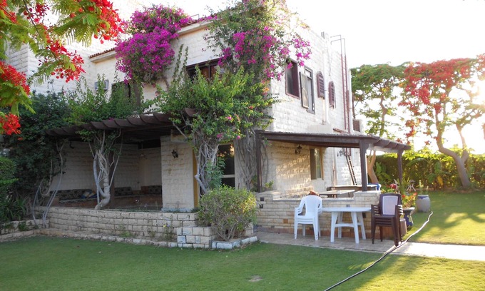 5 Bedrooms, 4 Bathrooms, 1000 Sq/m Garden. It's right next to the Sea. There are 2 Pools next to the house. A beautiful garden and the nightlife is amazing. The villa has many spaces with many bedrooms and bathrooms that it can sleep up to 10 people. Guests will have access to many lakes and a 13 kilometer Mediterranean Beach stretch. Guest will have 24 hours security guard and service. Guests have many privacy at the house and the neighborhood is very peaceful and quiet. Getting around the area is easy with many cars at your service with plenty of parking space. The nightlife is great in the Marina El Alamein area with many hotels and restaurant.