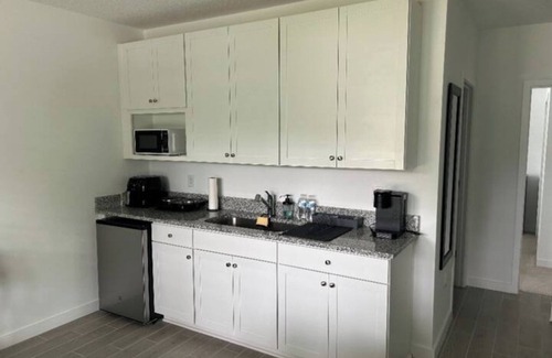 This private entrance suite sits in a new-construction home with a street view & outdoor covered seating area. Equipped with a private bathroom, bedroom with blackout curtains for a good knight sleep & closet. Kitchenette with a mini fridge, microwave, Keurig, Air Fryer, dining table & coffee table. For those who prefer to prepare their own food you will find plenty of pots, pans, cups, plates, & silverware. The studio area provides a love seat & Roku tv where you can log in to your streaming accounts. The bedroom provides a queen size bed & closet, ceiling fan in bedroom. The water in the entire home is filtrated & safe to drink from the faucet, there are complimentary water bottles, soft drinks & snacks.