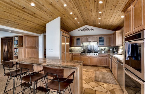 From the moment you enter, the water takes center stage. The celebrated deep blue waters of Lake Tahoe can be viewed from almost every room in the home. The large open-concept main living space is poised around a cozy stone hearth and is a perfect place to gather after a brisk day on the slopes. Adjacent is the large chef’s kitchen with a six-burner gas range, ample prep space and 4-person granite breakfast bar. Just behind is a formal dining area that can seat 8 more. From the dining area, you can access the large wrap-around porch with panoramic views, plenty of outdoor seating, and a large outdoor dining table for alfresco meals.