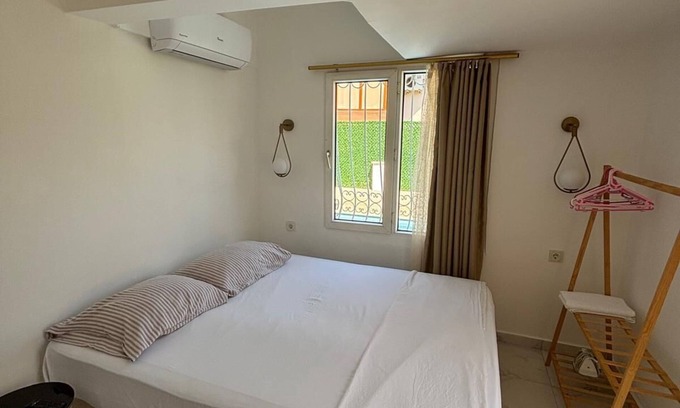 1+1 apartment with pool in Marmaris. Our pool is shared by 4 apartments. Pool access is limited to ages 7 and older. The apartment includes an iron, hairdryer, washing machine, TV, kettle, and stove. Smoking is prohibited inside the apartment.