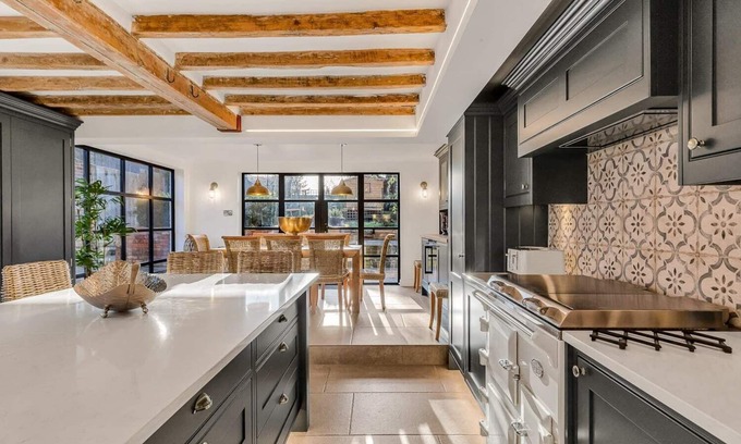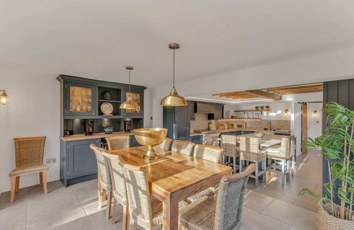 The kitchen, set under rustic ceiling timbers, boasts a central white granite island and comes equipped with a beautiful Everhot cooker, a large pantry and a wine fridge. As you wander past the kitchen, a step up invites you into the bright, elevated dining area with feature hanging lights and vast patio windows looking out onto the garden. The open-plan kitchen/dining space draws in an abundance of natural light during the day, whilst the exceptionally thought-out lighting makes for a delightfully cosy space after evening has fallen, perfect for enjoying an ambient dinner with family and friends.