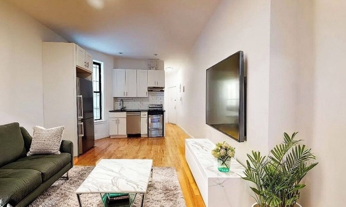 Stay comfortably in New York at this 1-bedroom apartment. The bedroom features a cozy queen bed, and the bathroom includes a relaxing bathtub. The unit is located on the ground floor so no exhausting stairs. It’s located facing back of the building creating complete privacy. Enjoy the nice living room with a futon for additional space. Guests can also take advantage of amenities like a hair dryer, AC, and heating. Make your holiday one for the books with a stay at our place.