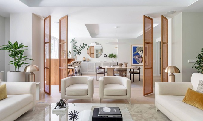 The living room, which is divided into two areas, has an exceptional central table perfect for enjoying relaxing time in the apartment and the large window is guarded by a bar area where you can prepare cocktails after a long day in the city. . The second central glass table is surrounded by sofas and armchairs that will help make the apartment cozy.