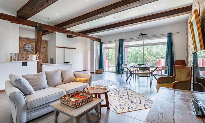 Le vaste séjour-salon s’ouvre entièrement sur le jardin et la terrasse, offrant un espace lumineux pour vos petits-déjeuners en famille ou vos dîners sous les étoiles. La cuisine équipée vous permettra de savourer les produits locaux (huile d’olive, vins du Sud, légumes du marché).