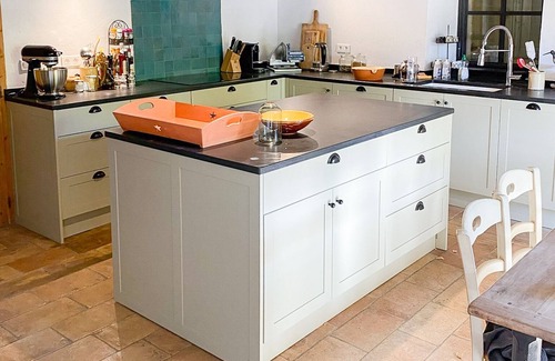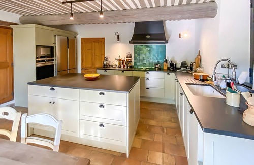 Kitchen: The kitchen is ideal for catering during your stay, it has large french doors out onto the covered dining terrace in the garden. There is also a small dining table for 8. The kitchen is equipped with a ceramic hob, electric oven and microwave. Also in the kitchen are dishwasher, food processor, and Nespresso.