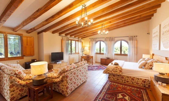 The spectacular ancient stone farmhouse with wood beams has an area of 400 m2 with capacity for 10 people on a farm of 11 hectares, with a large swimming pool, Vineyards, garden, cellar and own forest. Cal Agustí farmhouse is equipped with heating, air conditioning and free wifi.