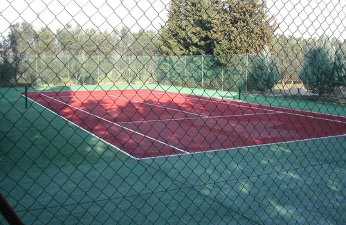 In the park there is a swimming pool with diving board, a tennis court, an outdoor amphitheater and a small house for children.